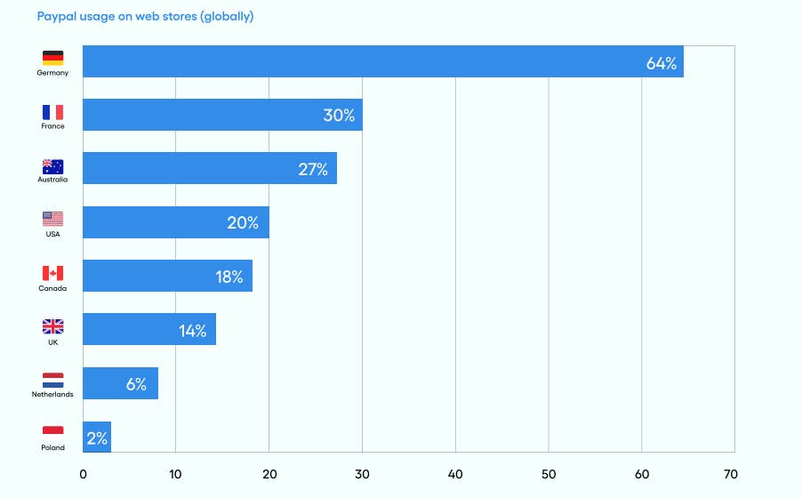 Germany, meanwhile, has a preference for PayPal, which accounts for 64% of web store transactions in the country, but it’s used in only 20% of transactions in the United States, and 14% in the United Kingdom.